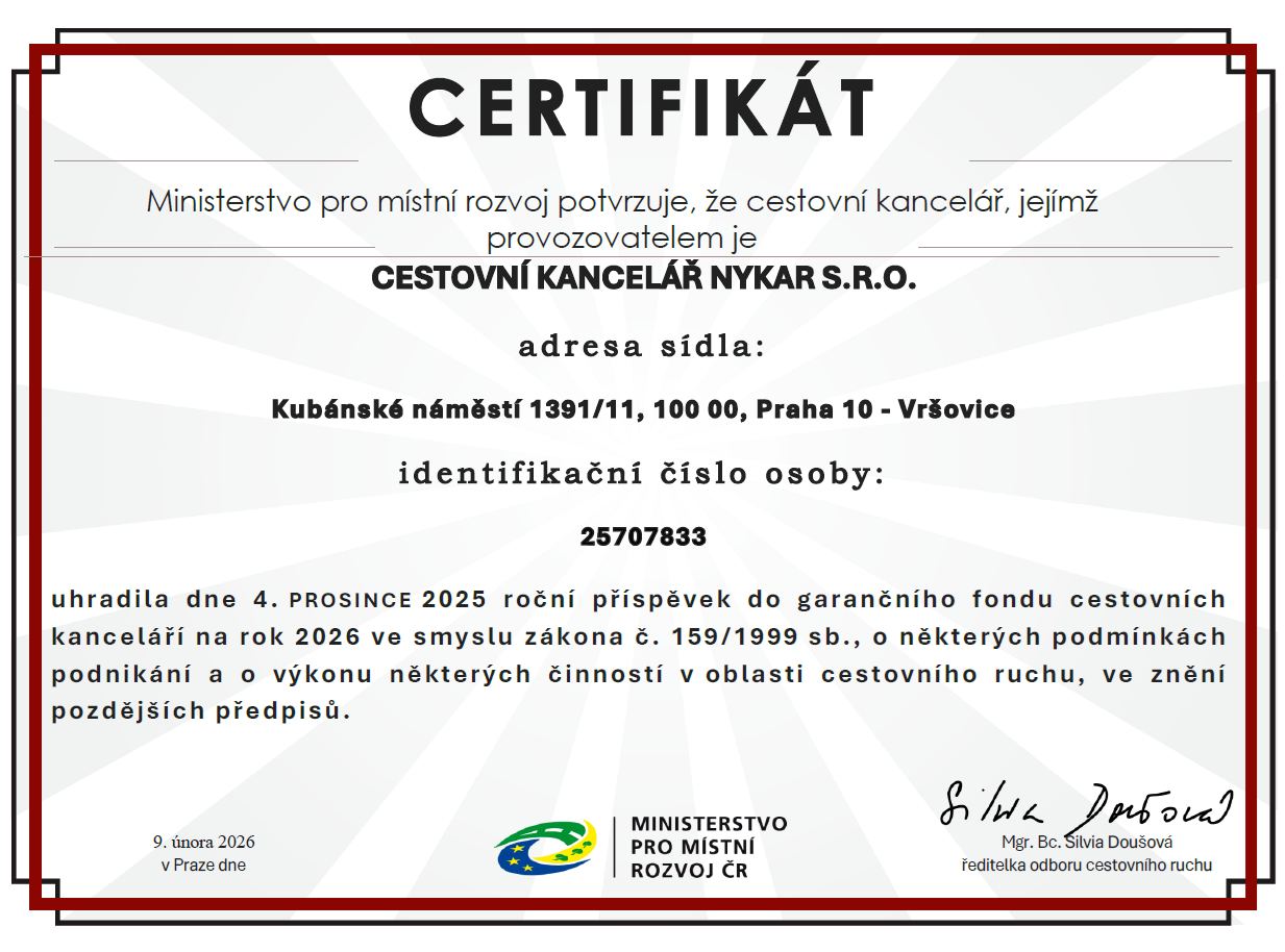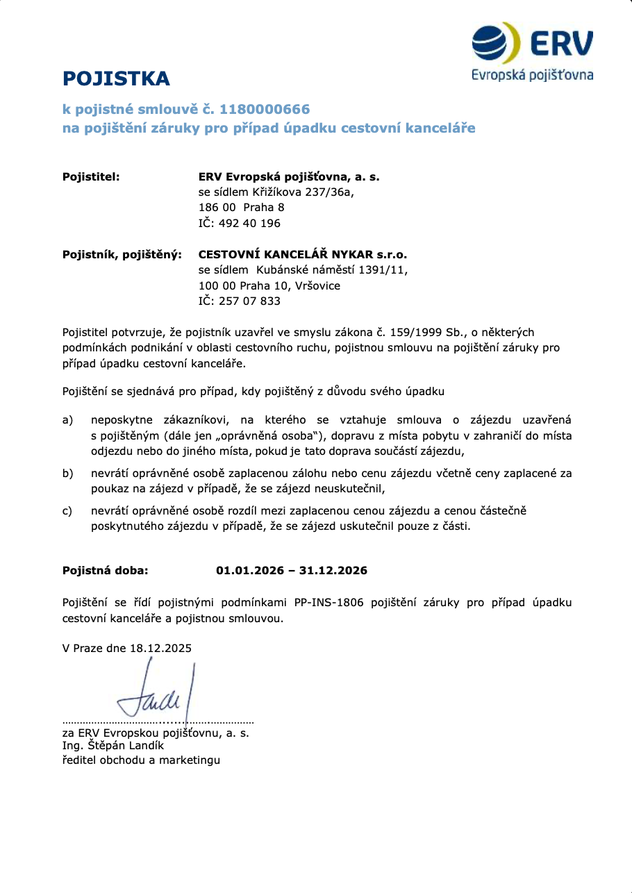 V souladu se zákonem č.159/1999 Sb. má naše cestovní kancelář od roku 2001 sjednáno pojištění záruky pro případ úpadku cestovní kanceláře. Pojistnou smlouvu máme od roku 2011 uzavřenu s pojišťovnou ERV. Internetová adresa této společnosti je www.ervpojistovna.cz. Seznam pojištěných cestovních kanceláří u ERV naleznete na následujícím odkazu: Seznam pojištěných cestovních kanceláří.